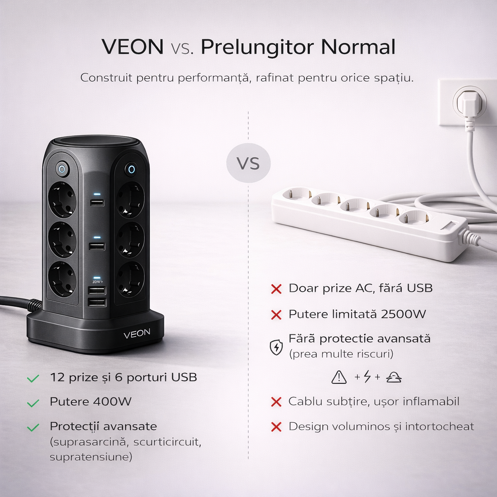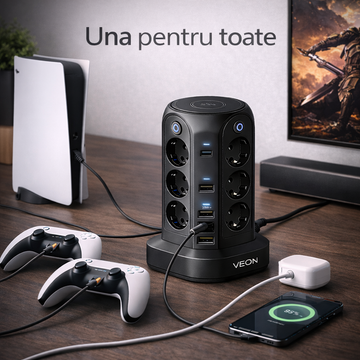 Prelungitor Tip Turn 4000W, 18 ieșiri, 12 Prize, 4x USB-A, 2x USB-C, Protecție Suprasarcină, Material Ignifug
