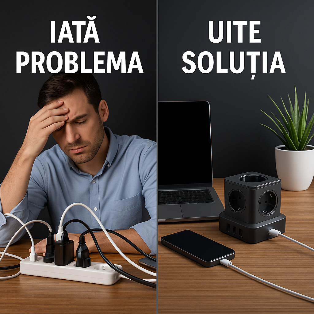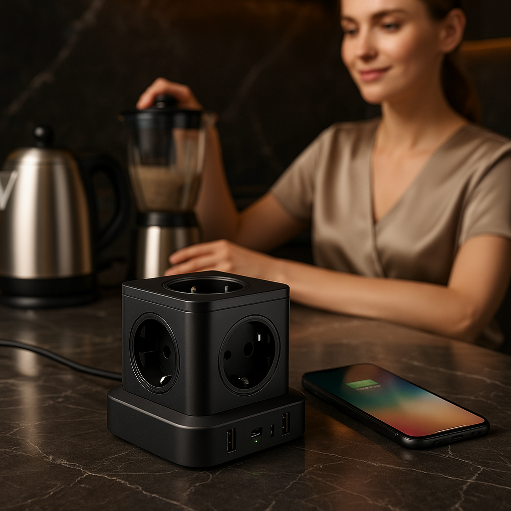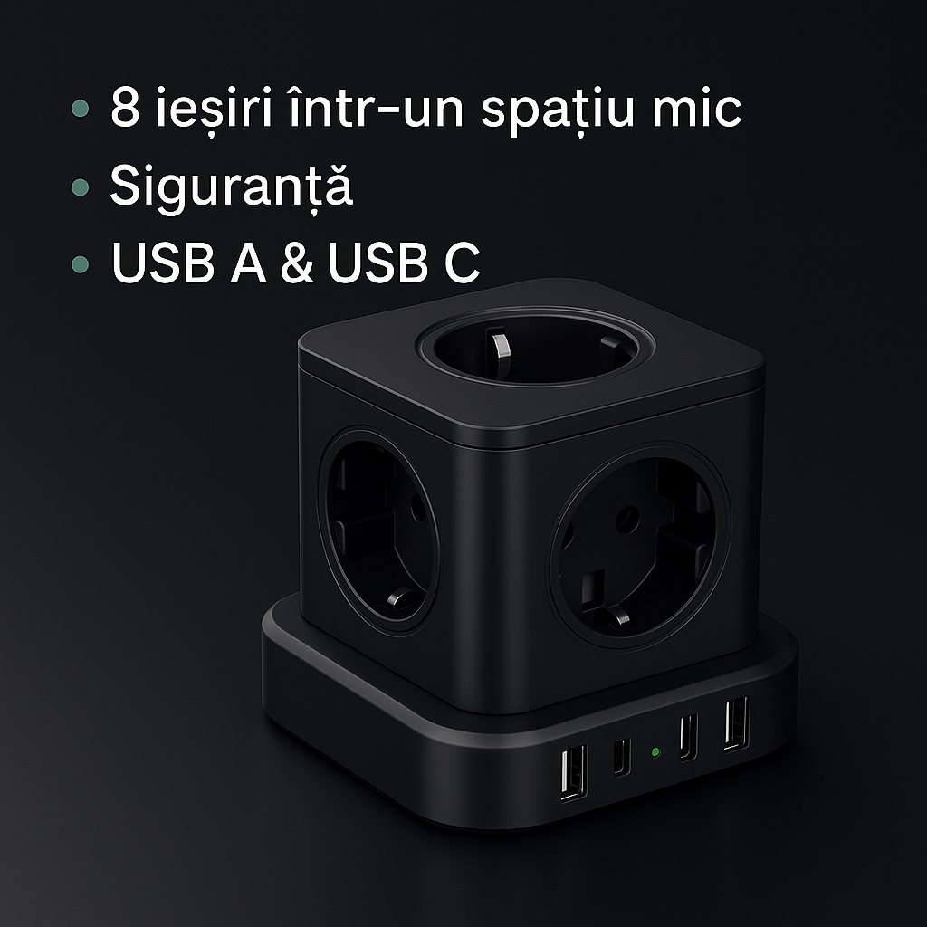 Prelungitor Cub Multifuncțional 4000W, 4 Prize, 2x USB-A, USB-C 20W, Protecție Suprasarcină, Scurtcircuit și Supracurent, Material ABS+PC