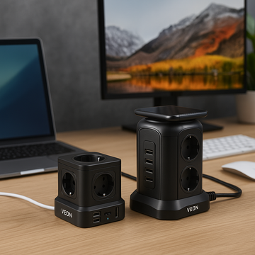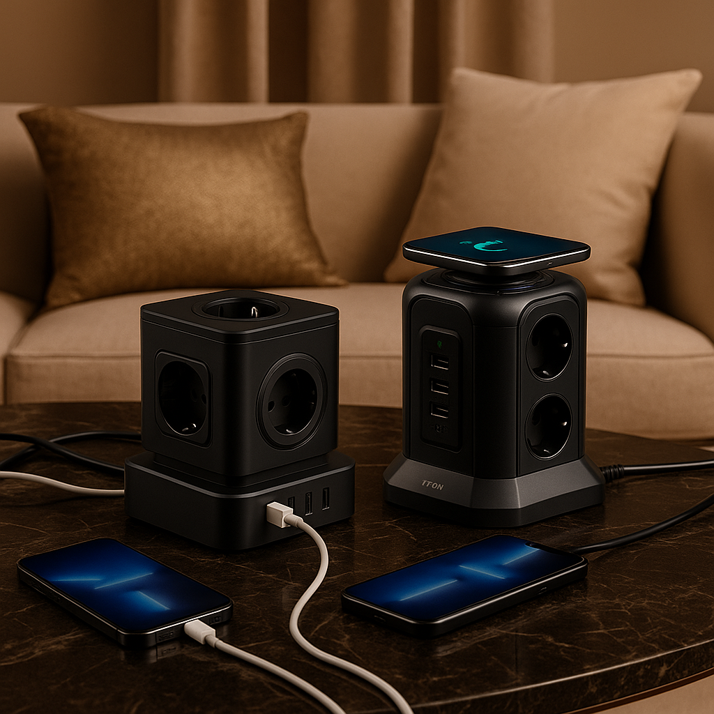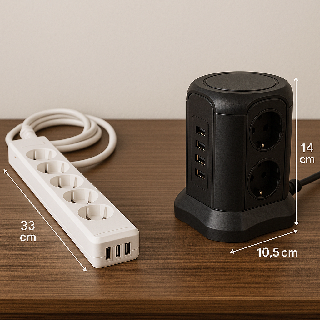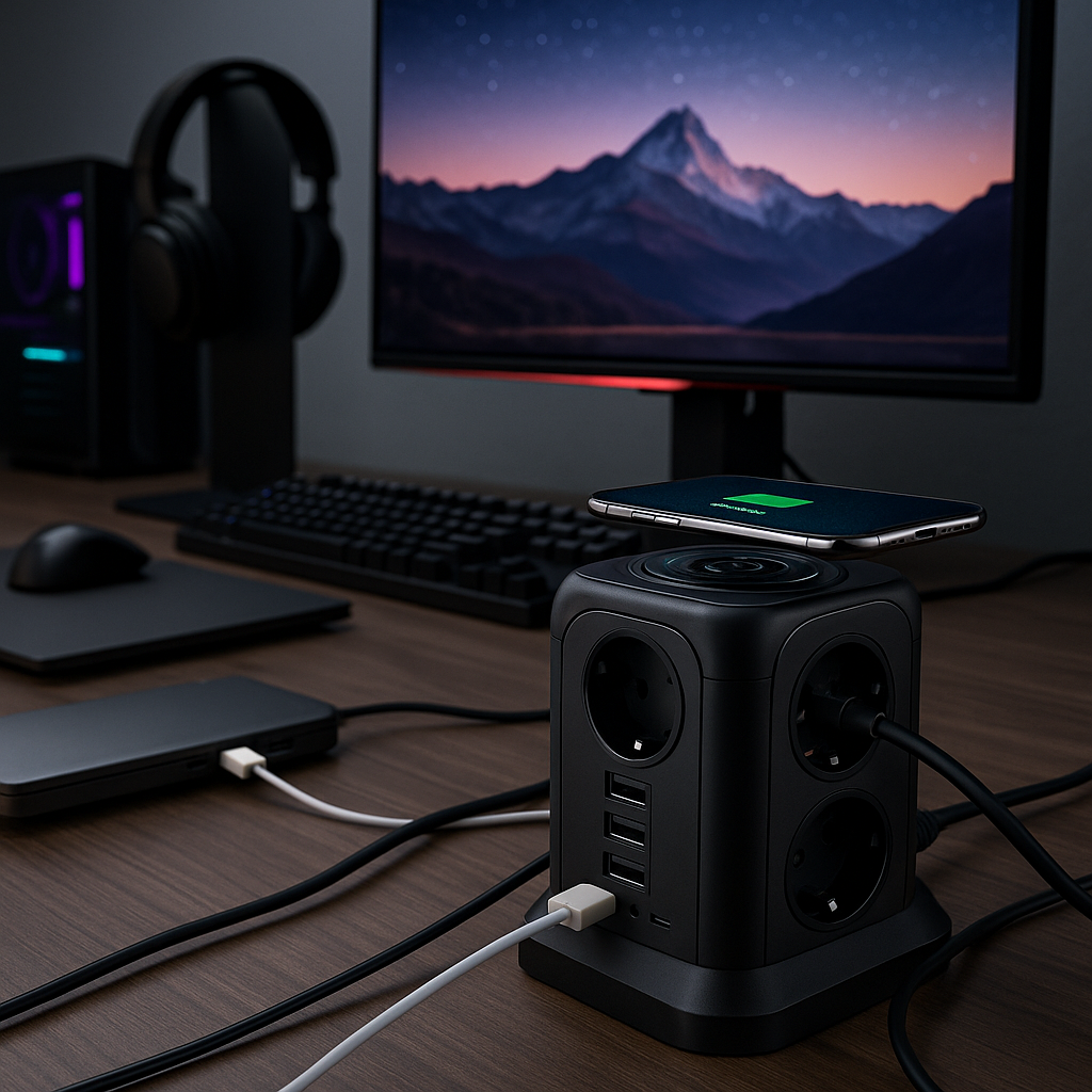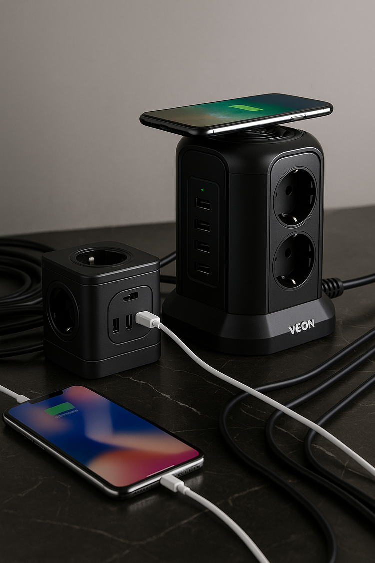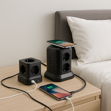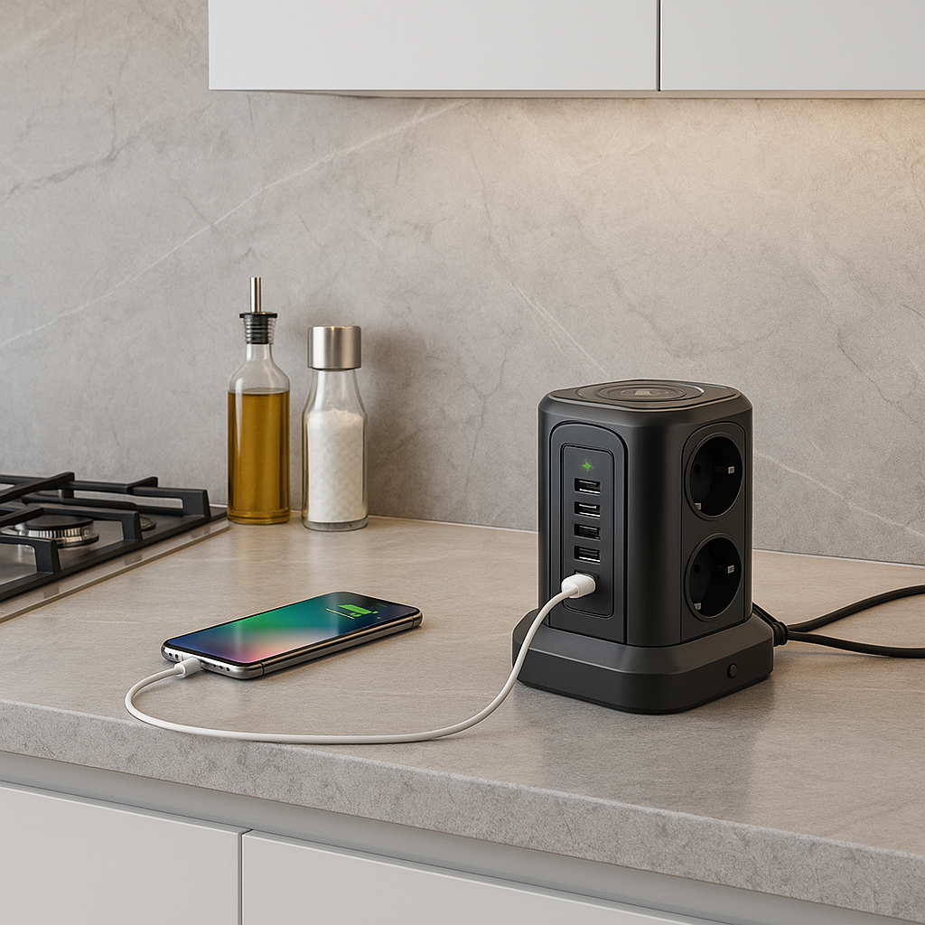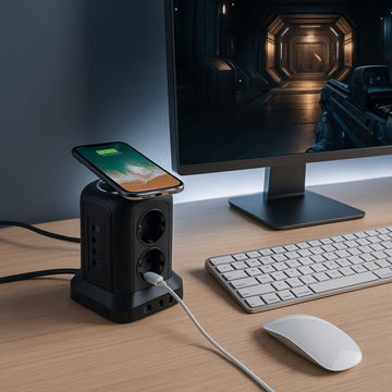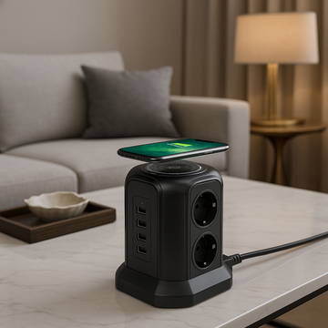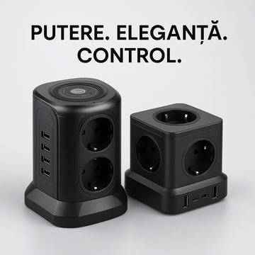 Prelungitor Tip Turn 4000W, 11 ieșiri, 6 Prize, 4x USB-A, Încărcare Wireless 5W, Protecție Suprasarcină, Material Ignifug