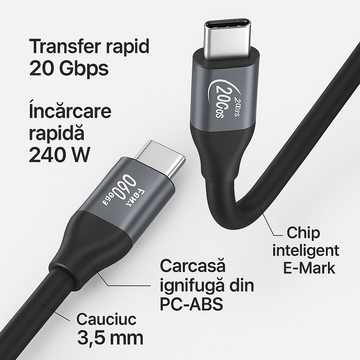 Cu o putere de până la 240W, cablul permite încărcarea rapidă a laptopurilor, telefoanelor și tabletelor compatibile, oferind o alimentare stabilă și eficientă. Pentru transferul de fișiere, suportă viteze de până la 20Gbps, ideale pentru backupuri, editare video sau conectarea la monitoare și docking-uri compatibile.