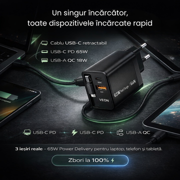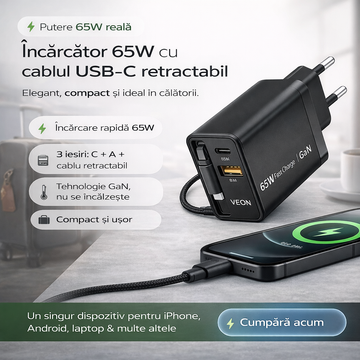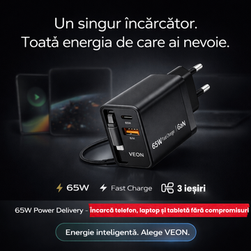 Pentru că VEON 65W oferă putere reală într-un format compact. Spre deosebire de încărcătoarele clasice, tehnologia GaN permite încărcare rapidă până la 65W, fără supraîncălzire și fără volum inutil.