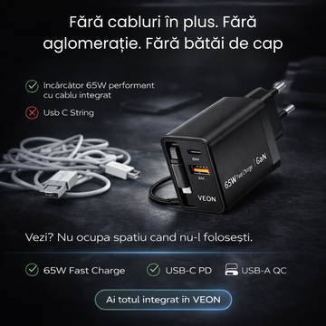 Majoritatea încărcătoarelor oferă fie putere mare, fie portabilitate. VEON le oferă pe ambele: USB-C PD, USB-A QC și cablu USB-C retractabil, totul într-un singur dispozitiv.