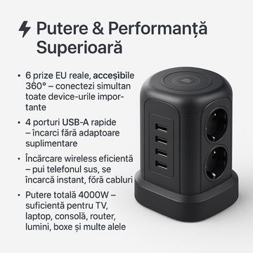 Acest prelungitor tip turn este ideal pentru casă sau birou, oferind suficient spațiu între prize și multiple opțiuni de încărcare pentru toate dispozitivele tale. Cu 9 prize AC, 3 porturi USB-A, 1 port USB-C cu încărcare rapidă (18W) și încărcare wireless 5W, turnul îți permite să alimentezi eficient telefoane, tablete, laptopuri, camere digitale și multe altele.