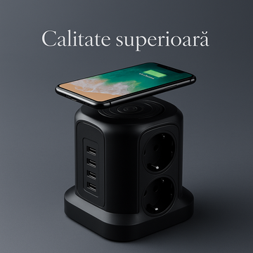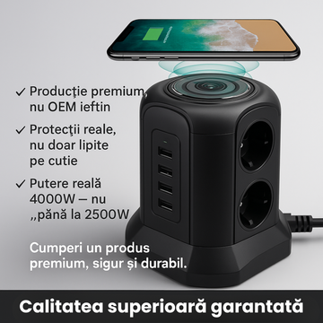 Prelungitor Tip Turn 4000W, 11 ieșiri, 6 Prize, 4x USB-A, Încărcare Wireless 5W, Protecție Suprasarcină, Material Ignifug